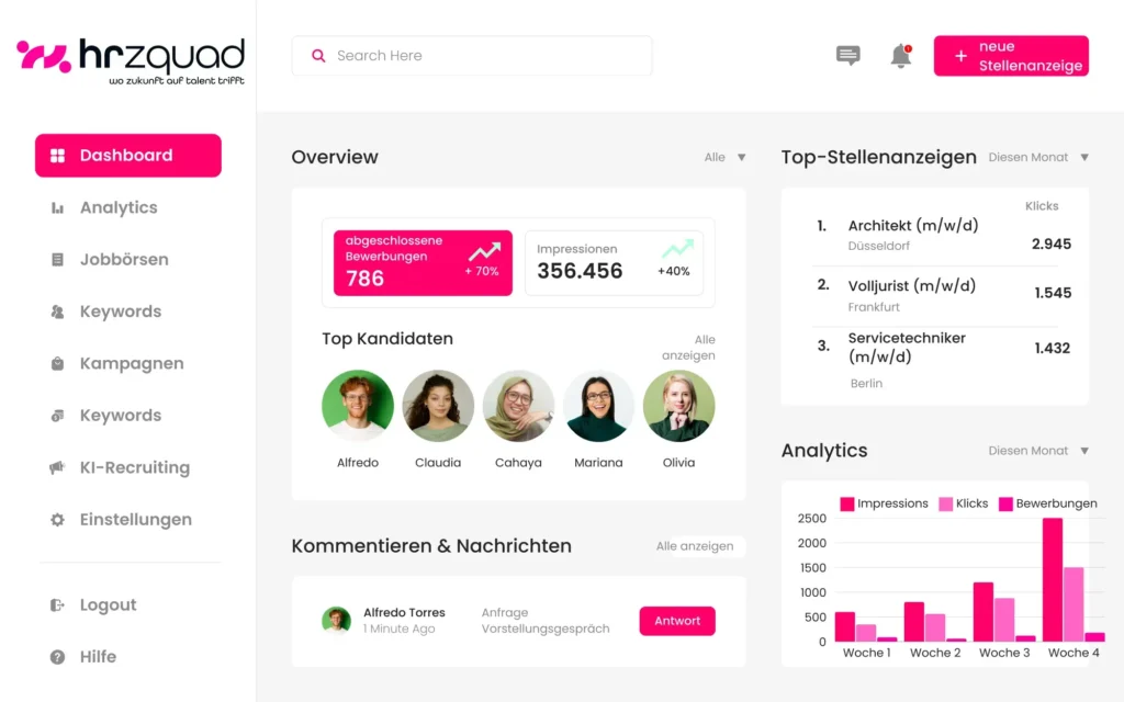 Wir nutzen über 500 Partnerportale und Social Media Kanäle wie Instagram Facebook und TikTok mit exakter Zielgruppenausspielung. Mit Re Targeting bleibt Ihre Stellenanzeige bei den passenden Talenten dauerhaft präsent.